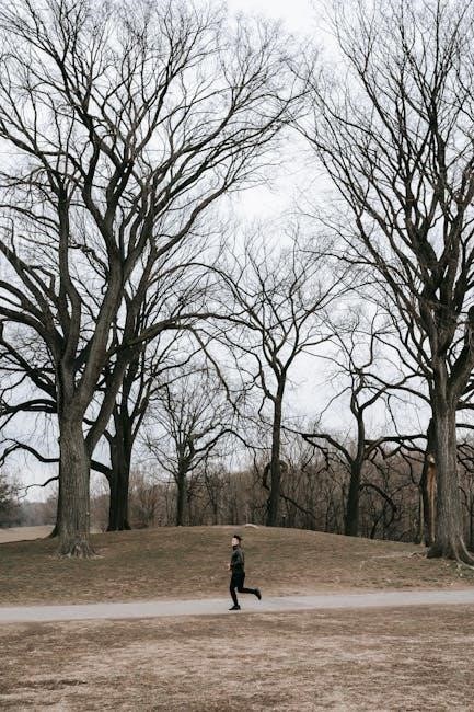 The Nick Bare Workout Program integrates cardio and endurance workouts to enhance cardiovascular fitness and mental resilience. Running is a central component, with structured sessions designed to improve speed, stamina, and overall endurance. The program progressively increases running distances and intensity, helping participants achieve milestones like improving 5K times or building up to longer runs. Cardio sessions are balanced with strength training to avoid overtraining, ensuring a well-rounded fitness approach. By combining running with weightlifting, the program fosters a hybrid athlete mentality, enabling individuals to build endurance while maintaining strength. This balanced approach promotes longevity and sustainability in fitness, making it ideal for long-term health and performance.